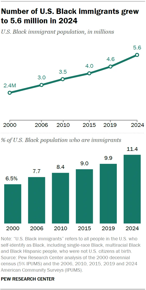 The Pew Research Center’s analysis of the U.S. Census Bureau’s 2024 American Community Survey reveals a dramatic expansion of the Black immigrant community. In 2000, there were approximately 2.4 million Black immigrants residing in the United States. By 2024, this number had surged to 5.6 million, more than doubling over a 24-year period. This significant growth accounted for roughly a quarter of the overall increase in the U.S. Black population during the same timeframe, which saw a total rise of 13 million individuals.